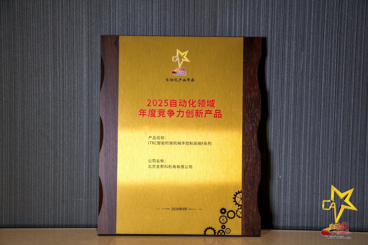 2026年4月9日,以“智驱新质 融创未来”为主题的2026中国自动化产业年会暨第二十一届自动化产业世纪行活动颁奖盛典在京举行。本届年会汇聚了6大领袖企业CEO现场论道,吸引200余家产学研单位深度参与,所设奖项历经4个多月,经过业内推荐、专家评审、用户投票等多轮遴选。北京发那科自主研发的《iTRC智能桁架机械手控制系统F系列》荣获“年度最具竞争力创新产品”奖项。